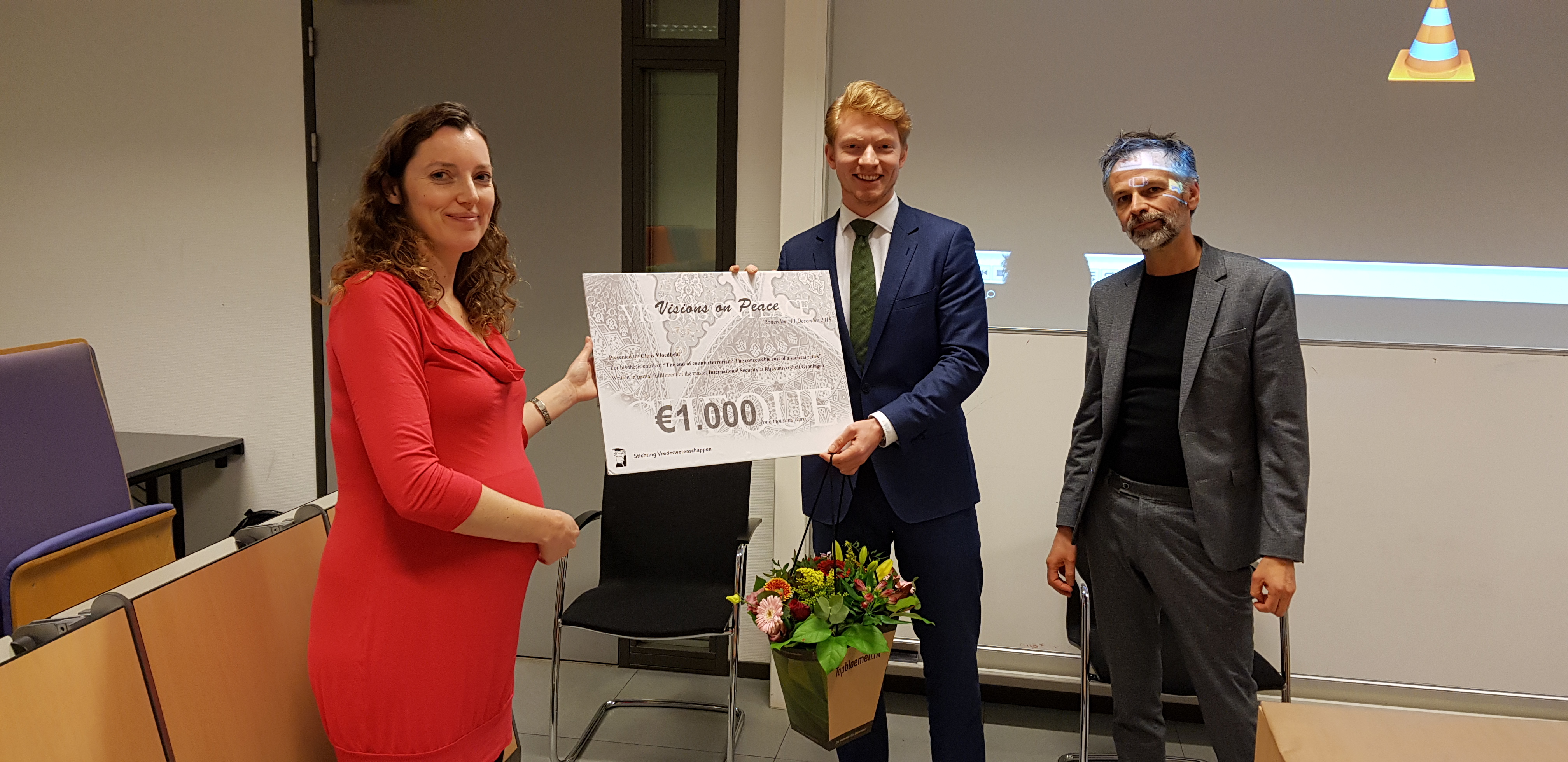 The Visions on Peace master thesis prize was awarded on Tuesday 11 December by Prof. dr. Ruud Welten (right, Chair of the Dutch Foundation for Peace Studies, Erasmus University) and dr. Lidewyde Berckmoes (left, Chairwoman of the Visions on Peace jury, African Studies Centre Leiden, University of Amsterdam) to Chris Vloedbeld (middle).